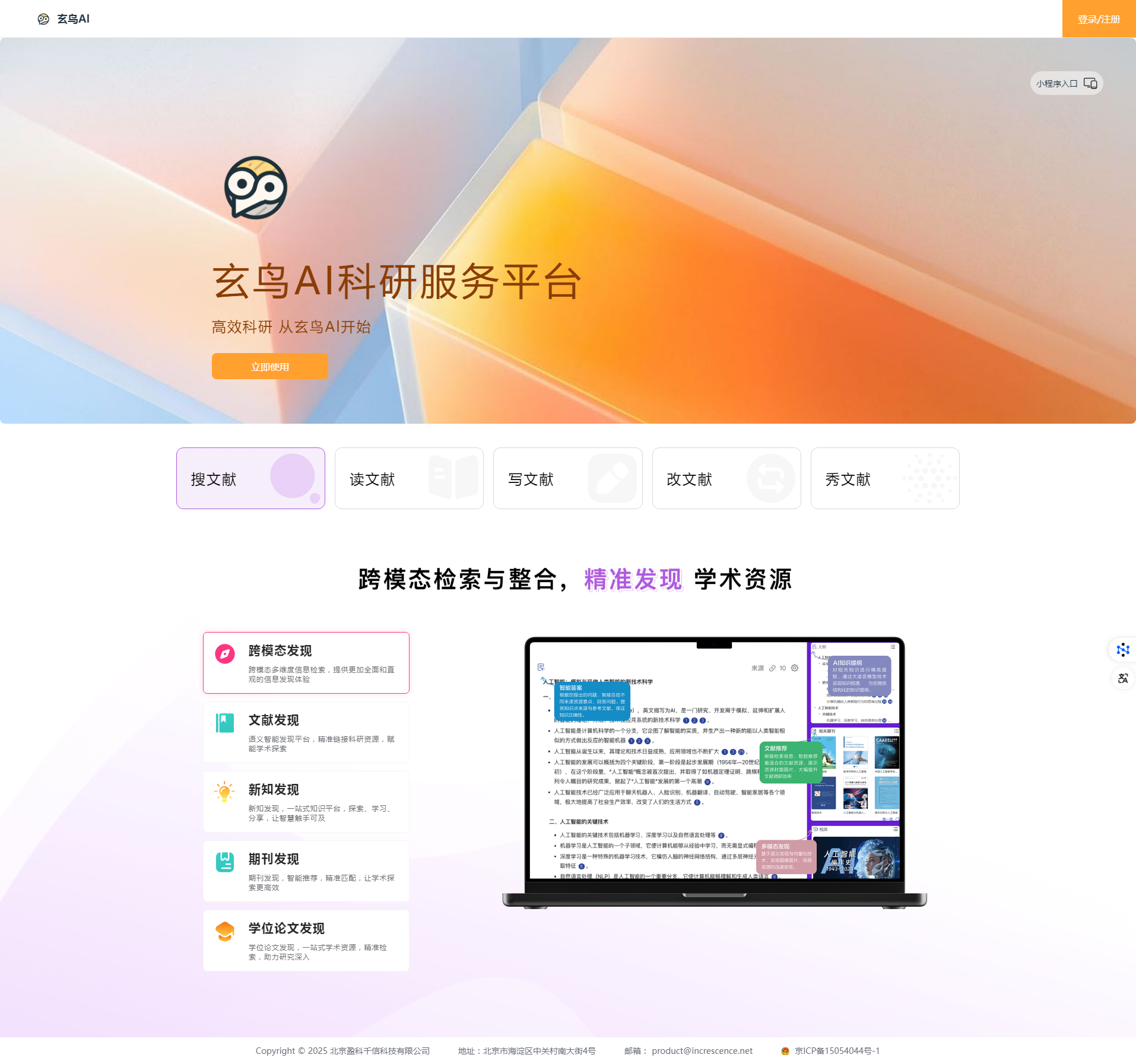 “玄鸟AI科研服务平台”深度融合多项AI前沿技术,为师生打造「科研-教学-学习」全场景智能解决方案。助力教师实现教学资源智能管理、论文品质提升、科研数据处理等核心需求,全面提升学术影响力;为学生提供文献研读、学术写作、数据分析及跨学科学习的智能支持,支持网页端与小程序端使用,有效提升学习研究效能。